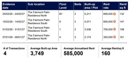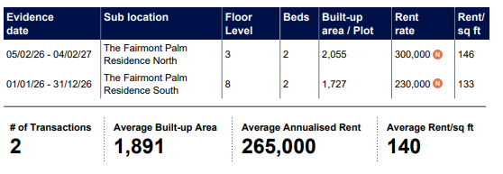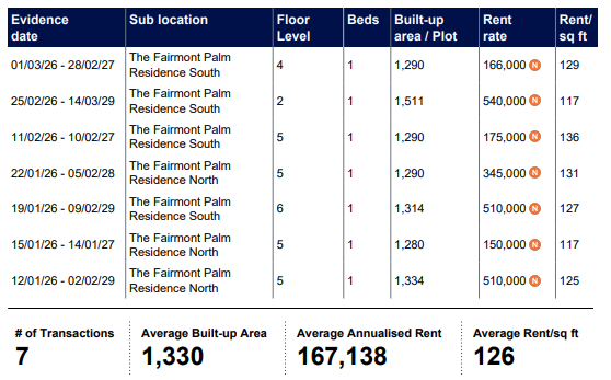The Fairmont Residences, Palm Jumeirah - Rents Agreed - Market Trends