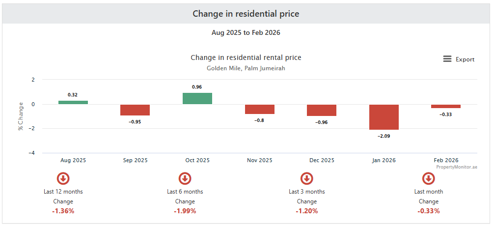 Palm Jumeirah: 3.79%Beach front communities such as Shoreline and Oceana Residences have performed better than Golden Mile during the past year. However, even the Fairmont Residences - which have a similar layout to Golden Mile - have experienced decreases in the rents agreed to new tenants.