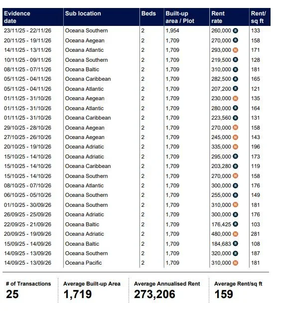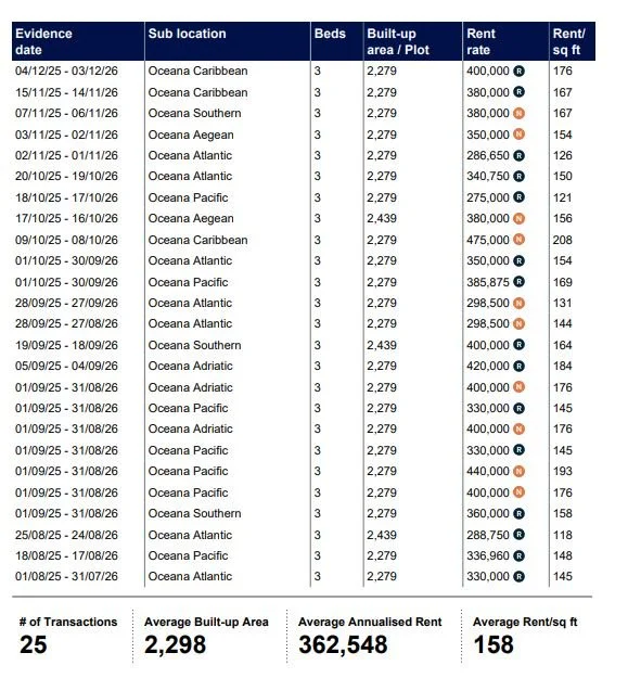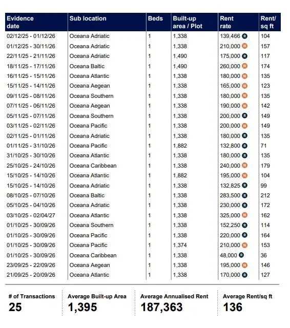 The Average Rents Agreed and Market Trends at Oceana, Palm Jumeirah.