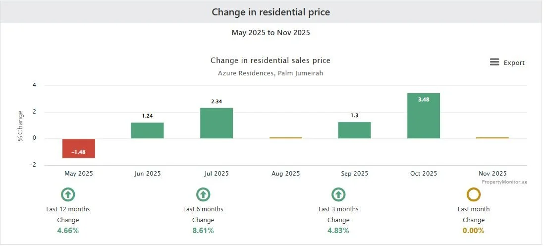 The Sold Prices trend at Azure Residences was generally negative at the start of 2025 but has improved during the past six months with growth of 2.43% during that period.