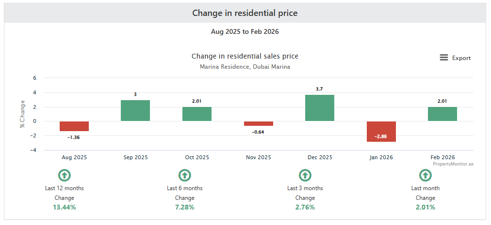 The Marina Residences community has followed the general trend for most of the Palm Jumeirah buildings / communities during the past 12 months.