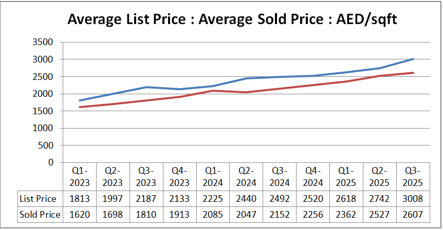 The average sold price (AED/sq.ft) increased by 18.6% during the past 12 months.