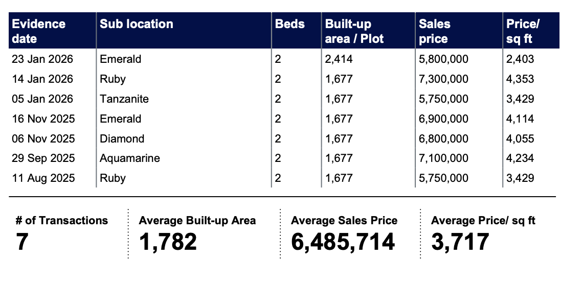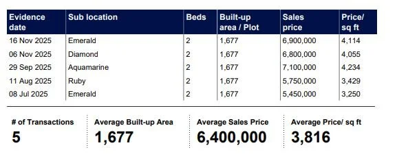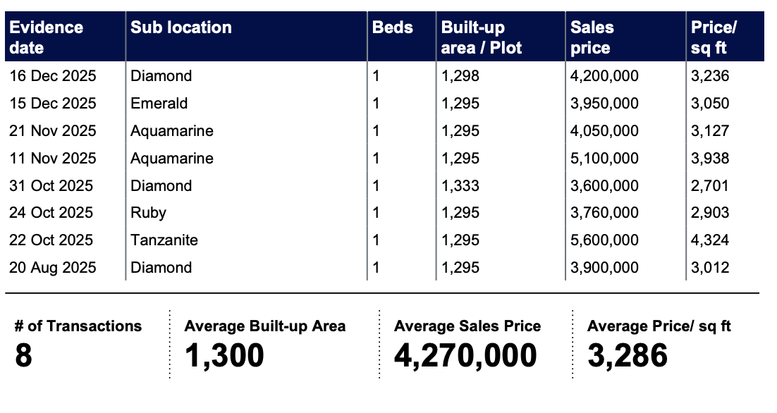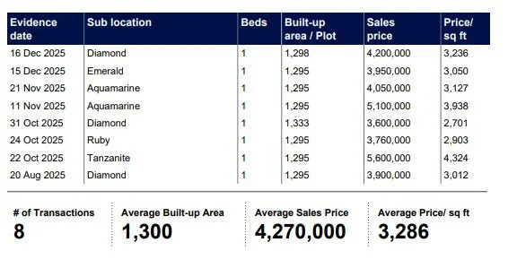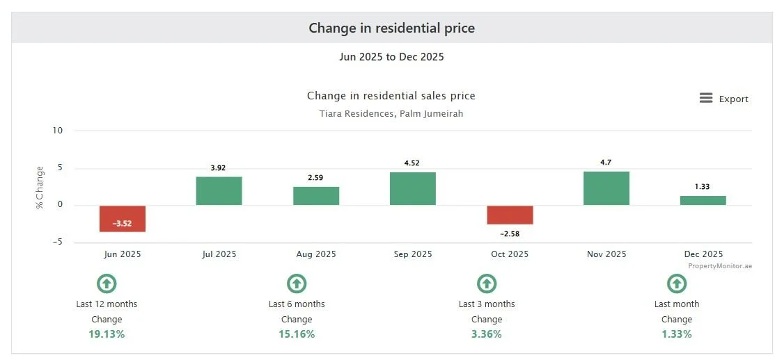 During the past 12 months, Tiara Residences has performed better than the average community at Palm Jumeirah with a 19.13% increase in the average price in terms of AED/square foot. There was negative growth during May, June and October but a recovery since then with a 6% increase during the last 2 months.